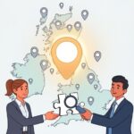 Illustration of the UK map, people walking to a location marked by a Google Maps pin, symbolizing local search results tracking.